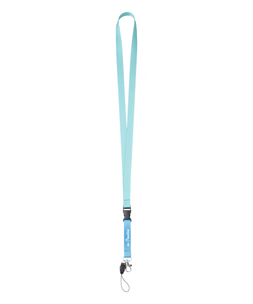 Personalizowana smycz o szerokości 15mm z RPET z odczepianym metalowym karabińczykiem i linką do telefonu. Z nadrukiem sublimacyjnym po dwóch stronach. Min. ilość: 100szt.