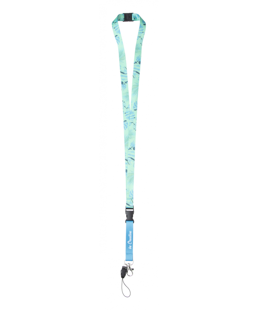 Personalizowana smycz o szerokości 15mm z RPET z odczepianym metalowym karabińczykiem, linką do telefonu i klamrą bezpieczeństwa. Z nadrukiem sublimacyjnym po dwóch stronach. Min. ilość: 100szt.