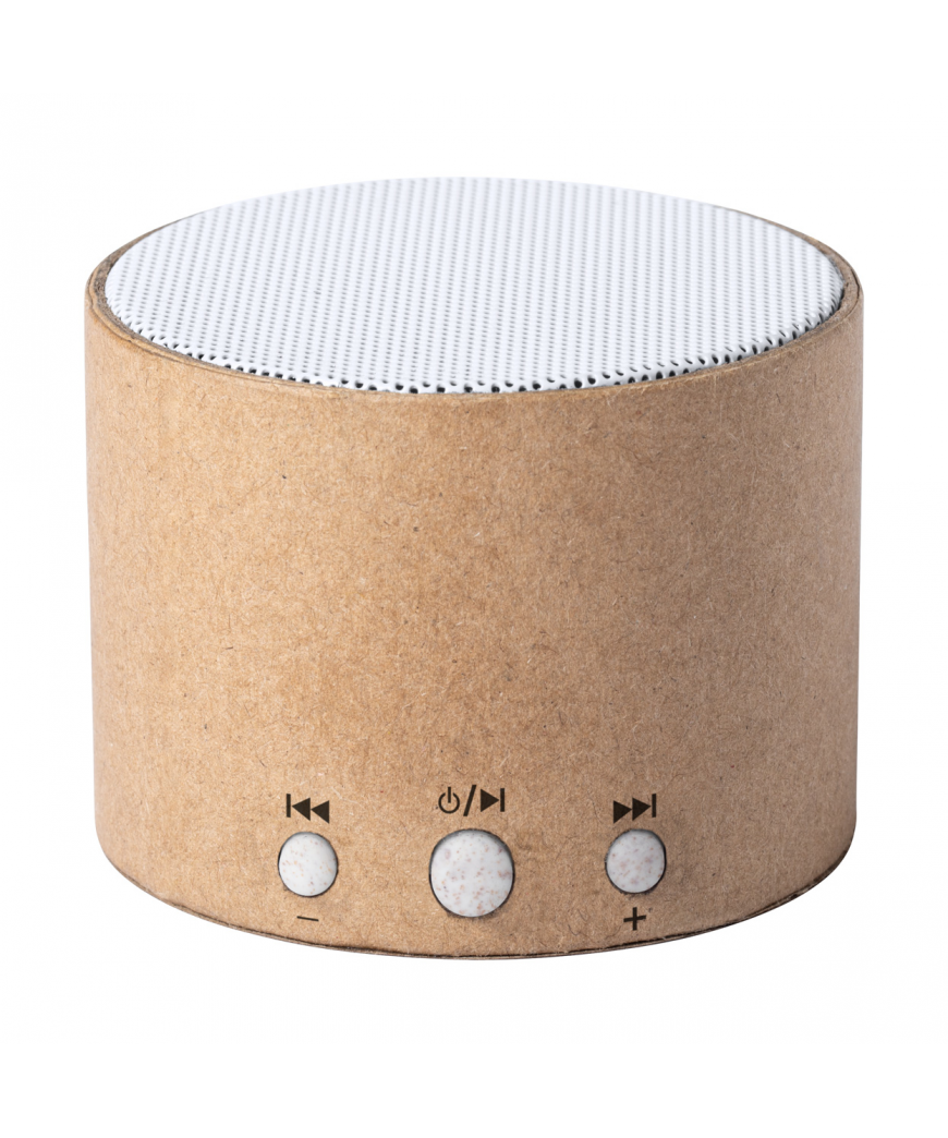 Głośnik Bluetooth z tektury z recyklingu z przyciskami ze słomy pszenicznej i wbudowanym akumulatorem. W zestawie kabel USB.