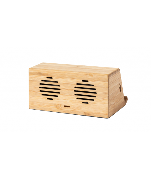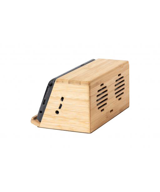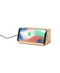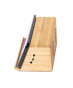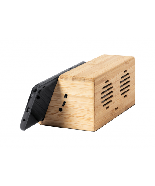 Bambusowy głośnik bluetooth z uchwytem na telefon, wbudowaną szybką ładowarką indukcyjną (10W) i akumulatorem. W zestawie kabel USB.